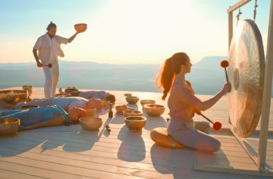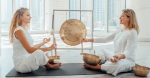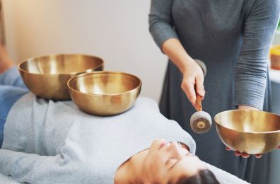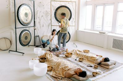 In a sound healing session, participants lie down while the practitioner uses sound tools to create vibrations that help release tension and restore energetic balance.